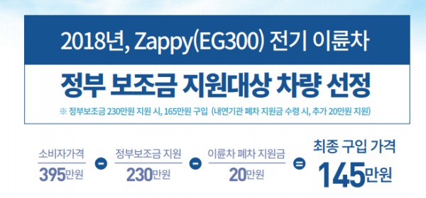 대림오토바이는 2018년 5월 15일, 환경부로부터 전기스쿠터 재피(EG300)를 대상 한 정부 보조금 지원대상 차량 인증을 획득했다. 그리고 사전계약을 진행하며 성능에 대한 구체적인 정보를 확인할 수 있었다.