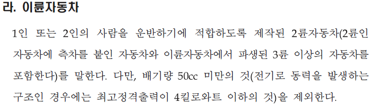 오토바이 배기량 50cc 미만의 것, 전동 오토바이 출력은 4킬로와트 (5 마력) 이하의 것은 제외한다고 나와있죠.