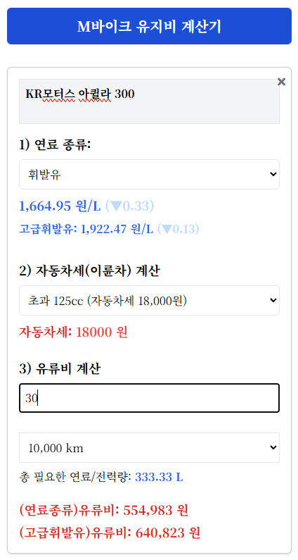 아퀼라 300은 출퇴근 시 도심 주행에 적합하고, 연비 덕에 주유비가 적어요. 레저로는 서울-강화도 왕복(120km)도 연료비 3,000원 내외로 가능하죠. 다만, 장거리 시 열 관리가 필요해요.